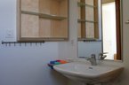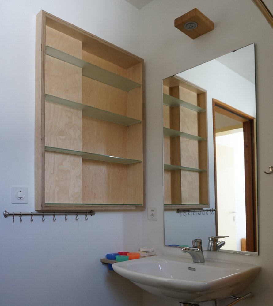 Im Rahmen einer kleinen Renovation des Badezimmers wurden neue Ablageflächen geschaffen und ein grosser Spiegel angebracht, in dem sich die Gäste, auch aus sitzender Position, bequem betrachten können.
